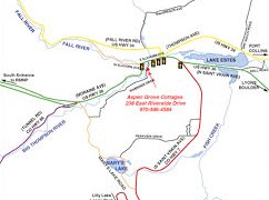 The town has a free shuttle bus in the summer. Most lodges and hotels are within an easy walk of a shuttle stop. Although there is typically a connection from town into Rocky Mountain National Park, it will not be running in 2021. See the Rocky Mountain National Park maps page for more info on their shuttle.